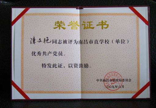 我校音乐教研组组长、声乐教师陈文艳同志,在中国共产党建党88周年之际,获中共南昌市教育局党委授予的,南昌市直学校(单位)“共产党员”称号。