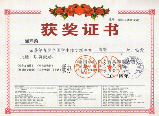 由世界中文作家协会、《小作者选刊》、《少年文摘报》、《诗歌月刊》、《东方文学》、《成功》杂志教育版联合主办的第九届全国学生作文新奥赛成绩揭晓,我校参赛学生在语文老师李艳、季红学的精心指导下,取得了好成绩,现特向获奖学生表示祝贺!