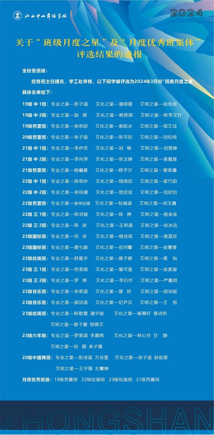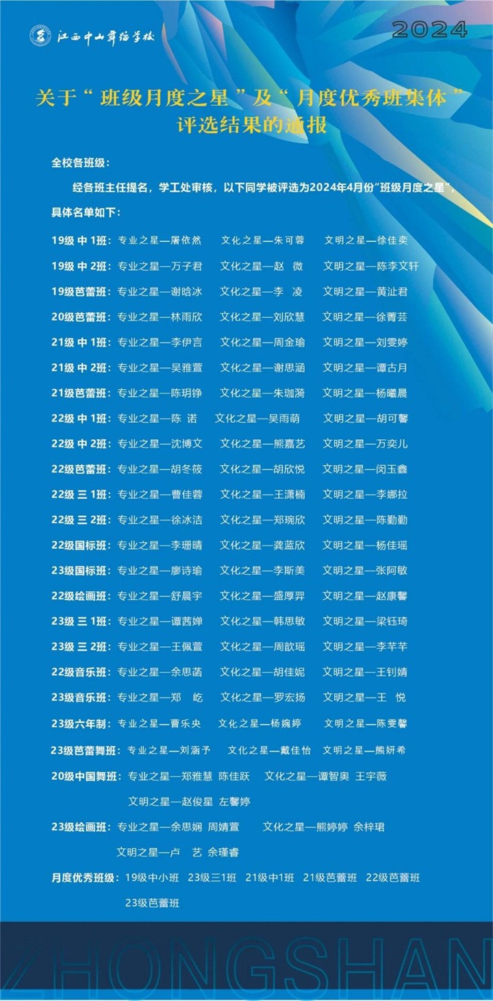 这些喜获“月度之星”称号的同学们,正是学校坚持“专业文化双优教学”理念的教学体现,也是“不断进步”的中山精神之真实写照。他们在思想品德养成、专业文化学习、班级生活等方面都取得了较大进步,得到师生们的一致认可,希望受表彰的同学在今后的学习中继续努力,再创佳绩。我们坚信,每一位中山学子都将在这勤奋的土壤中孕育出更多璀璨的青春梦想,同时也勉励未受表彰的同学积极向榜样学习,争取在下一个月度评选中获得荣誉。