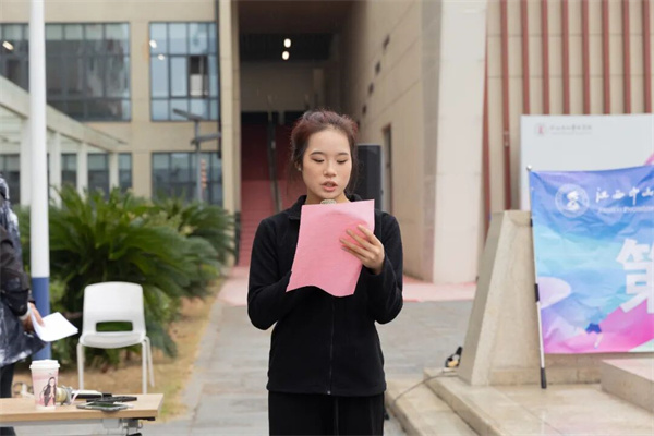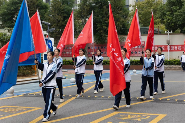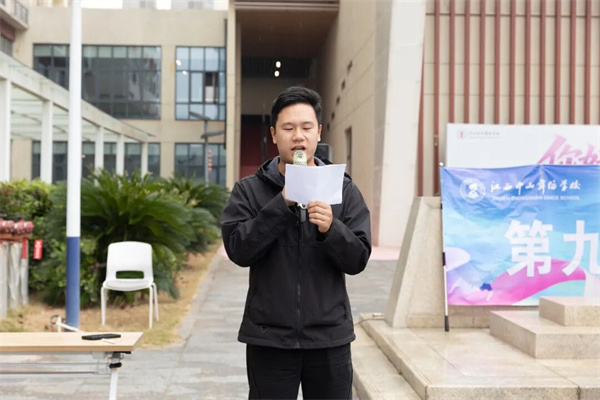 运动员代表付于彤宣誓:我们要赛出风格、赛出水平,展现中山舞蹈学子拼搏进取、团结协作的风貌;尊重裁判裁决、尊重对手、尊重观众,秉持 “友谊第一、比赛第二” 的精神,以饱满热情投入赛场。
